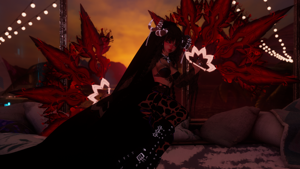 mask, horns, devil's tail, dancing fans, pistol (activation of shooting with money - touch),